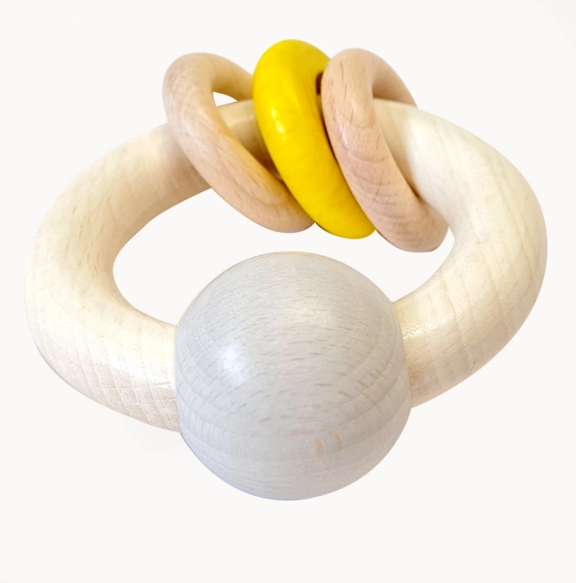Hochet en bois pour vos enfants, aide à développer les premières compétences motrices et est un compagnon idéal à la maison comme en voyage. Tous les matériaux sont résistants à la salive, ce qui protège le jouet contre les dommages.