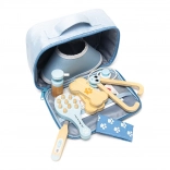 Ouvrez la trousse textile et commencez à soigner. Les enfants ont immédiatement sous la main un stéthoscope, un thermomètre, un otoscope, un bandage et d’autres accessoires, qu’ils rangent facilement dans le sac.