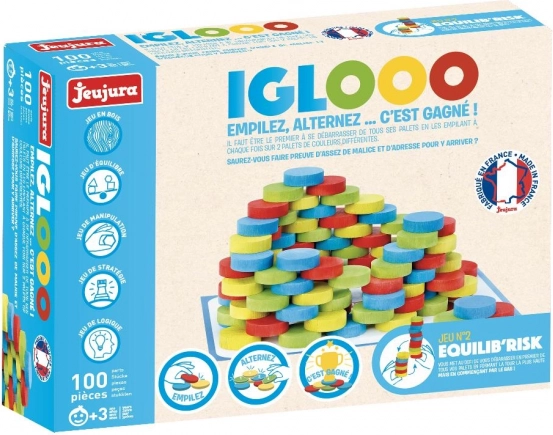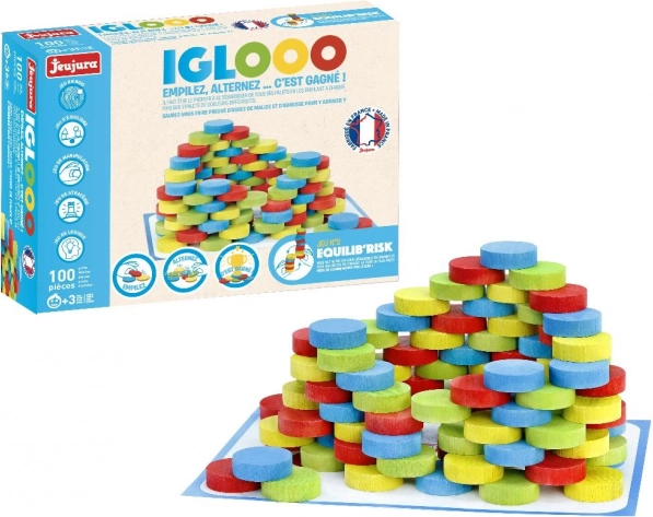 Jeujura Igloo est un jeu de construction en bois fabriqué en France, qui stimule la créativité et améliore la motricité fine. Il contient 100 pièces en bois massif, sûres grâce à l’utilisation de peintures et vernis à base d’eau.