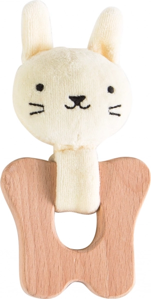 Le hochet de dentition et le bavoir sont fabriqués en coton biologique et en bois certifié FSC.