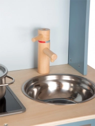 La cuisine pour enfants en bleu fumé avec des poignées en cuir élégantes offre une impression de cuisine réaliste.