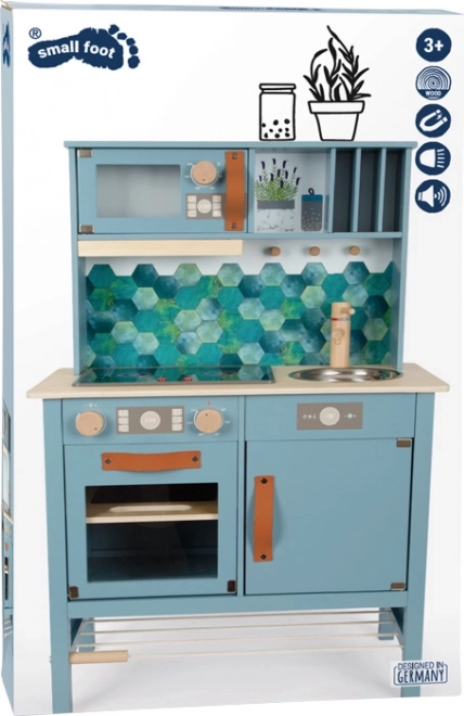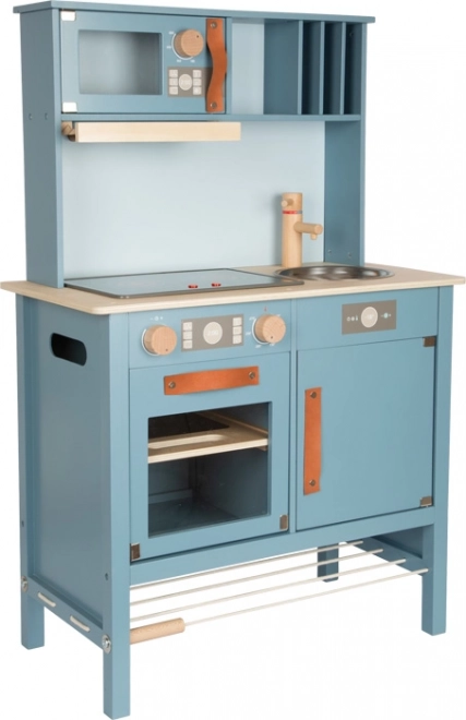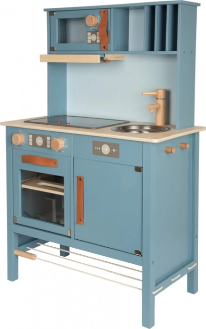 Une cuisine en bois pour enfants stylée et durable dans une teinte bleu fumé avec poignées en cuir. Le set comprend des ustensiles et de la vaisselle en métal, dont une casserole et une poêle, offrant une expérience de cuisine et d’organisation réaliste.