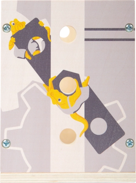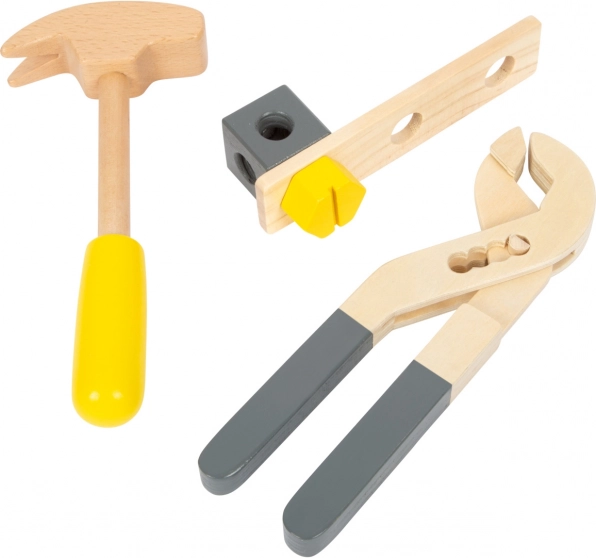 Marteau, clé, tournevis, pince étau et étau – le tout en bois robuste. Les enfants s’initient de manière ludique aux compétences « artisanales » de base.