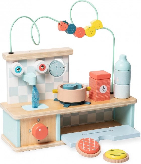 Cette cuisine en bois VILAC de haute qualité combine activités motrices et éléments de cuisine réalistes. Les enfants peuvent tourner les boutons, ouvrir la porte du four, “cuire un poisson” dans la casserole et faire couler l’eau dans l’évier, tandis que le labyrinthe de fruits coloré et la bouteille et la salière empilables stimulent l’imagination et la coordination œil-main.