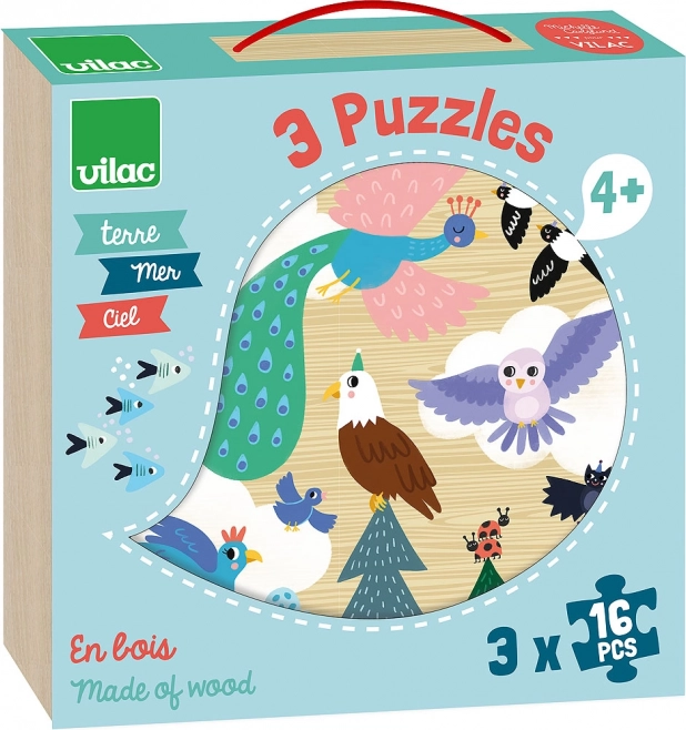Découvrez le merveilleux monde de la nature grâce à cet ensemble de puzzles en bois. Chacune des trois images propose un thème différent : des aventures dans les nuages, le monde sous-marin et l’exploration de la jungle. La scène céleste ravit avec un magnifique paon, un aigle et d’autres oiseaux. Les motifs marins prennent vie avec une grande baleine, une pieuvre et de sympathiques petits poissons. La scène terrestre présente un tigre, un crocodile et un perroquet dans une joyeuse ambiance de jungle.