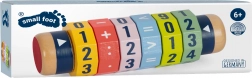 Six anneaux rotatifs avec chiffres et symboles permettent de créer des exercices d’addition, de soustraction, de multiplication et de division jusqu’à 99 – une manière ludique d’en comprendre les bases.