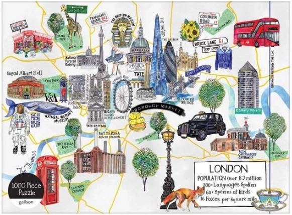 Ce puzzle design propose une carte riche et détaillée de LONDRES avec des monuments emblématiques tels que Buckingham Palace, Trafalgar Square, le Royal Albert Hall, Tower Bridge ou le London Eye. Son emballage élégant à finition mate fait plaisir comme cadeau et comme pièce décorative pour la bibliothèque. Illustration : Hennie Haworth.