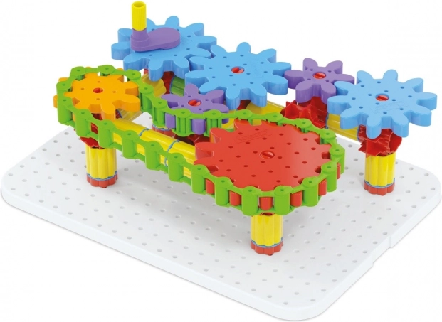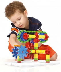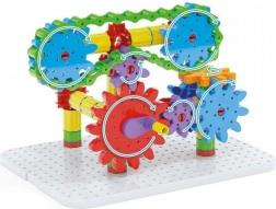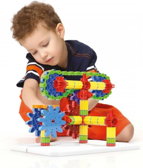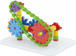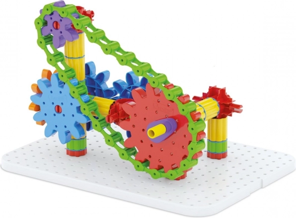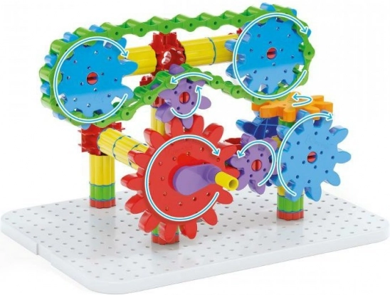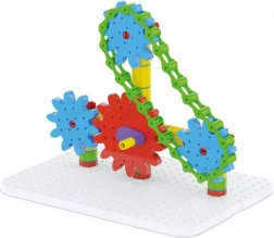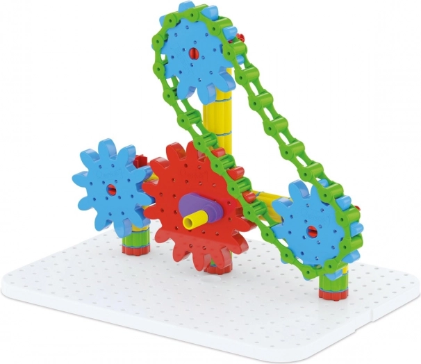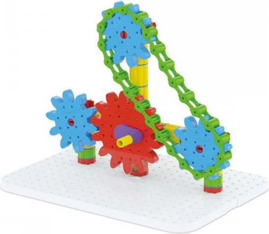 Le jeu est fabriqué en plastique durable et destiné aux enfants à partir de 5 ans. Il contient des composants tels qu'une plaque de base blanche, des engrenages de différentes tailles, une chaîne et beaucoup plus, permettant aux enfants d'explorer un nouveau monde de mouvements mécaniques.