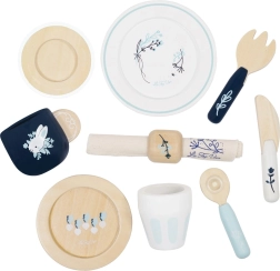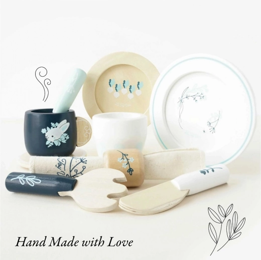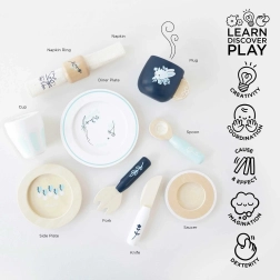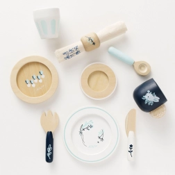 Ce service de table pour enfants de haute qualité est conçu pour durer tout en étant esthétique dans toute chambre d’enfant. Des motifs bleu et blanc élégants avec des illustrations végétales, des surfaces en bois lisses et des peintures à base d’eau sûres en font un choix idéal pour le jeu quotidien.