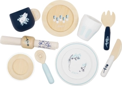 Tasse, soucoupe, gobelet, 2 assiettes, couverts et serviette avec anneau – tout ce dont les enfants ont besoin pour servir et s’entraîner aux bonnes manières à table.