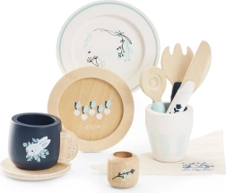 Le coffret comprend tout le nécessaire pour les petites tables: tasse, soucoupe, gobelet, 2 assiettes, couteau, fourchette, cuillère et serviette en tissu avec anneau décoratif. En servant, les enfants développent leur créativité, leur habileté et apprennent les bases du savoir‑vivre à table. Fabriqué de manière éthique en bois FSC durable avec un accent sur la qualité et la sécurité.