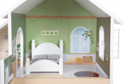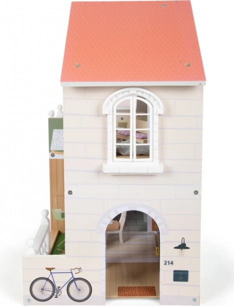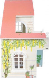 Élégante maison de poupées en bois avec façade ouverte offrant trois pièces, une terrasse et un petit jardin pour un jeu réaliste. Inclut un escalier en colimaçon, des fenêtres ouvrantes, une salle de bain moderne avec paroi en plexi et 8 éléments de mobilier fonctionnel avec accessoires textiles. Sa conception compacte et stable au design clair et moderne est idéale pour la chambre d’enfant comme pour le salon.