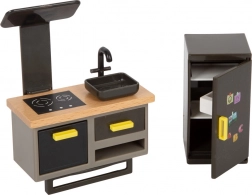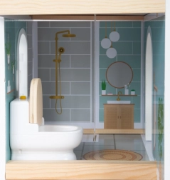 Inclus, 8 pièces de mobilier et des détails pratiques pour un jeu authentique : toilettes ouvrantes, placards de cuisine et réfrigérateur avec portes ainsi que des tiroirs. Des coussins et une parure de lit textiles apportent de la chaleur à la chambre, tandis que l’escalier en colimaçon relie les deux niveaux au sein d’un intérieur bien pensé avec paroi de douche en plexi.