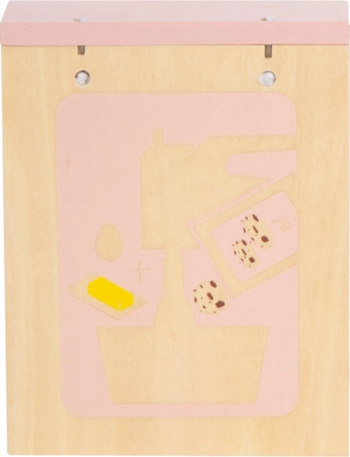- bol, rouleau à pâtisserie, spatule, plaque de cuisson, biscuits en tissu, beurre en bois, œuf à scratch, boîte avec mélange à pâtisserie et recette illustrée