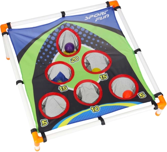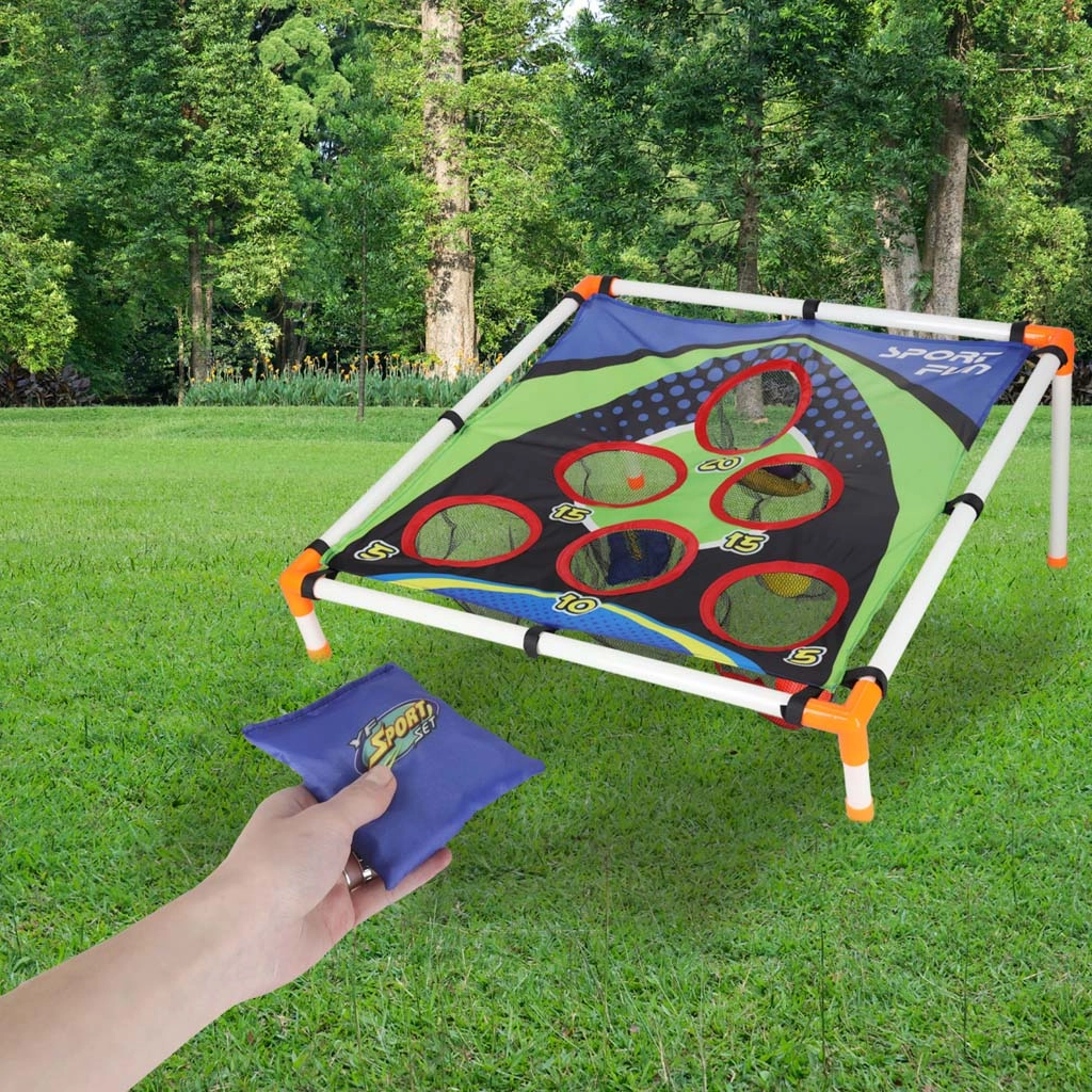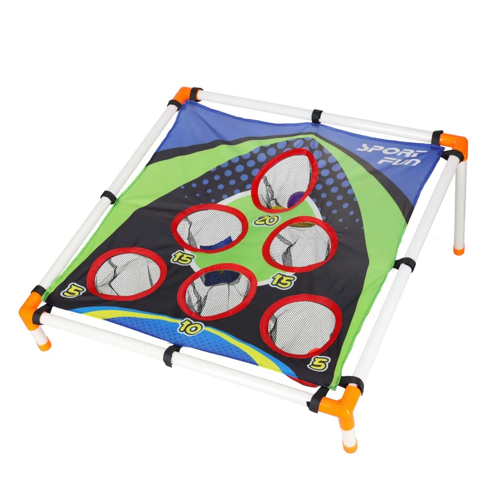 La structure légère en tubes plastiques avec support incliné assure la stabilité, la surface textile robuste avec cinq à six ouvertures comptabilisées retient les sachets et les balles dans des filets. Le montage est intuitif et l’ensemble du jeu se transporte aisément partout.