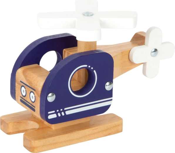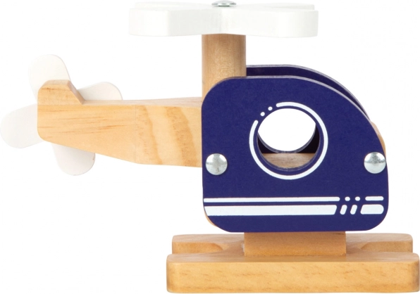 L'hélicoptère en bois a une finition naturelle en bois avec des détails bleus et blancs, lui donnant un aspect ludique et assurant sa sécurité pour les enfants.