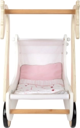 Décoré de couleurs douces et de formes simples, ce landau pour poupées rend leur soin quotidien chaleureux et accueillant. Grâce à sa construction robuste, il peut accueillir des poupées mesurant jusqu'à 46 cm. Le landau est équipé d'un baldaquin en tissu rétractable et inclut une literie à motifs fleuris rouge et blanc roses en deux pièces. Les roues en caoutchouc assurent un mouvement silencieux et fluide sur toute surface, tandis que la structure finement travaillée en contreplaqué et bois massif offre une grande durabilité.
