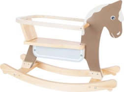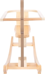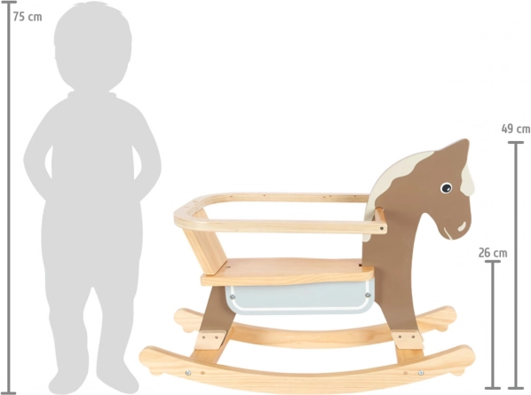 La sécurité avant tout : l’arceau amovible et le dossier haut maintiennent les jeunes cavaliers en selle, les butées garantissent une bascule sereine et les patins larges apportent de la stabilité. La selle à 26 cm de hauteur facilite l’accès même pour les plus petits.