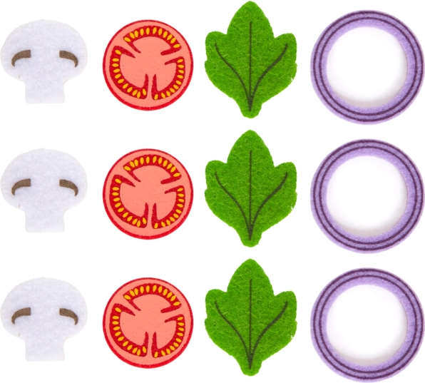 L'ensemble comprend 12 répliques en feutrine d'ingrédients tels que des champignons, des tomates et des oignons, offrant aux enfants la possibilité de préparer une variété de plats.