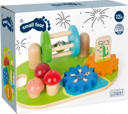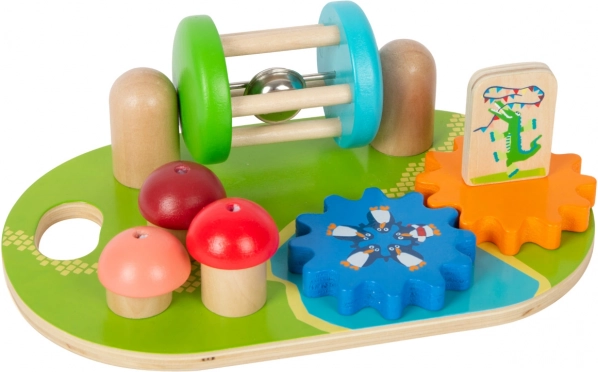La planche en bois offre différents éléments mobiles comme des engrenages et des boutons à tirer pour développer la motricité fine.