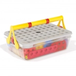 Toutes les pièces se rangent dans une boîte solide avec poignée. Le couvercle perforé sert de surface de construction – idéal à la maison comme en voyage.