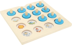 Plateau de jeu en bois avec pièces en plastique décorées d’images d’astronautes, de fusées et de planètes. Sert de jouet éducatif pour développer la mémoire et les compétences cognitives.