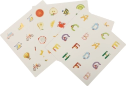 Ensemble de cartes éducatives avec des lettres colorées de l’alphabet et des illustrations correspondantes. Aide à apprendre et à reconnaître l’alphabet de manière ludique et interactive.