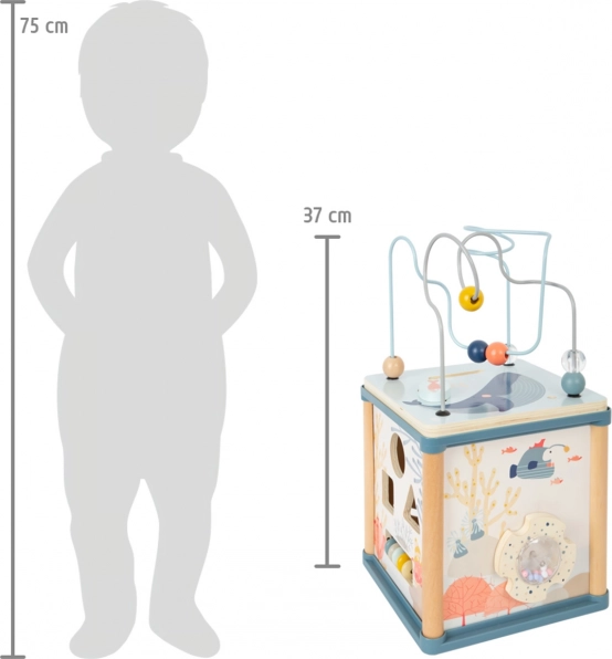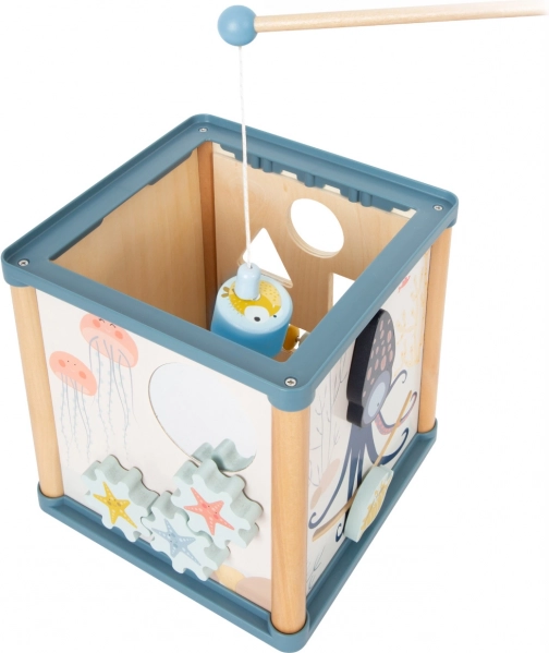 Ce cube d’activités en bois au motif du monde sous-marin propose cinq faces pleines d’animations et, en plus, une amusante pêche magnétique – les pièces du puzzle à encastrer peuvent être pêchées avec la canne magnétique directement à l’intérieur du cube. Les illustrations colorées des animaux marins stimulent la perception visuelle, tandis que la pieuvre élastique ajoute une touche ludique qui incite les enfants à explorer davantage.