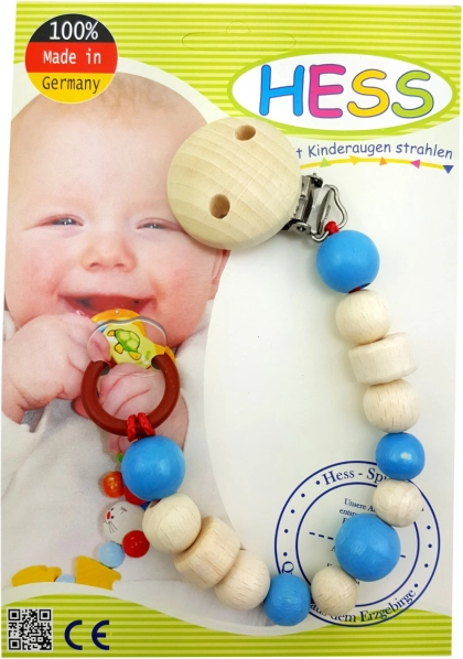 Pratique, le clip pour tétine en doux bleu clair garde la tétine toujours à portée de main et propre. Il dispose d’un clip métallique pour une fixation sûre aux vêtements et d’un anneau universel en silicone pour accrocher la plupart des tétines. Fabriqué en Allemagne en bois de qualité avec des peintures sûres, résistantes à la salive et à la transpiration.