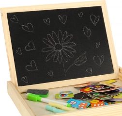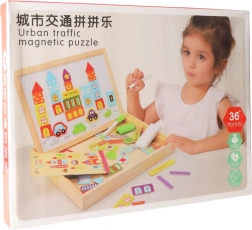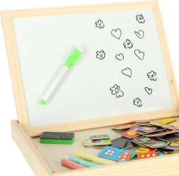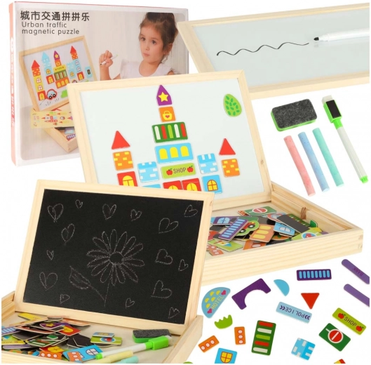 Tableau éducatif recto‑verso 2‑en‑1 en bois naturel offrant une face blanche magnétique pour composer des puzzles magnétiques et écrire au marqueur, et une face noire à la craie pour le dessin classique. Inclus : env. 100 aimants sur le thème de la ville, des craies de couleur, un marqueur effaçable à sec avec effaceur en feutrine et une éponge – idéal pour développer la créativité et la motricité fine.