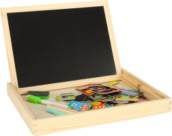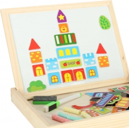 Le tableau offre deux surfaces de travail : une face blanche magnétique pour composer des images avec des pièces magnétiques et écrire au marqueur effaçable à sec, et une face noire pour écrire à la craie. Le thème « ville » encourage les jeux de rôle et l’apprentissage des couleurs, des formes et des bases de l’aménagement de l’espace.