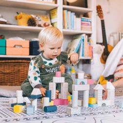 Des teintes douces comme plus vives et des motifs simples favorisent la reconnaissance des couleurs et des formes, le développement de la logique et de la perception spatiale lors des premières constructions.