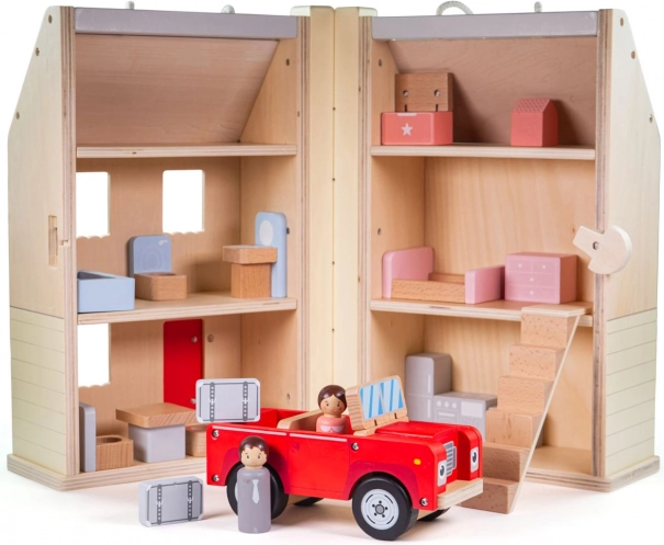 Maison en bois pliable BIGJIGS TOYS avec mobilier, figurines et petite voiture. Set portable, sûr et créatif pour enfants dès 18 mois.