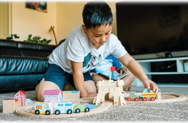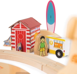 Ce circuit côtier offre beaucoup de jeu créatif tout en étant éducatif. Les enfants peuvent faire circuler le train, passer par le grand château de sable, longer les cabanes de plage colorées et apprendre à trier les déchets grâce aux panneaux magnétiques à fermeture. L’ensemble est de haute qualité, fabriqué à partir de matériaux obtenus de manière responsable avec des peintures et vernis sûrs.