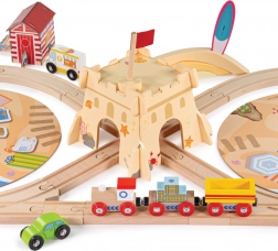 Partez pour un littoral ensoleillé avec ce circuit de train en bois à thème et apprenez aux enfants à prendre soin de la nature. Le set comprend 70 pièces, dont un train en 3 parties, des petites voitures, un château de sable avec passage et des cabanes de plage. Des panneaux magnétiques pour le tri des déchets sont inclus, favorisant la motricité fine, les compétences cognitives et une démarche de jeu durable.