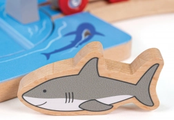 Des requins en bois finement peints apportent un thème océanique au jeu et stimulent les histoires et la créativité.