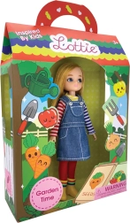 - Poupée LOTTIE jardinière, petit pull rayé, robe en jean, collants rouges, bottes jaunes, pelle, petit râteau, arrosoir, 2 boîtes
