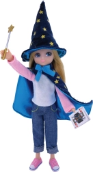 - Modèle de magicienne : t-shirt rose et blanc, pantalon en jean, cape bleue ornée d’étoiles, chapeau haut, baskets roses, baguette magique et paquet de cartes.
