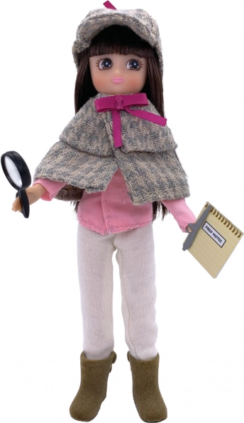 - Modèle de détective : manteau à carreaux marron-vert décoré d’un nœud rose, casquette, chemise rose, pantalon beige, bottes marron, carnet de notes, stylo et autocollants avec empreintes digitales.