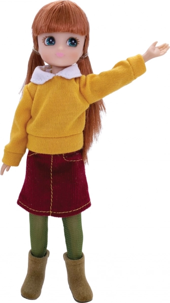 Poupée en tenue d'automne - pull jaune, jupe rouge, collants verts et bottes marron. Idéal pour les promenades automnales.