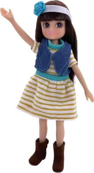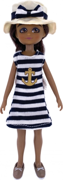 Poupée avec robe à thème nautique et accessoires assortis, prête pour les aventures estivales.