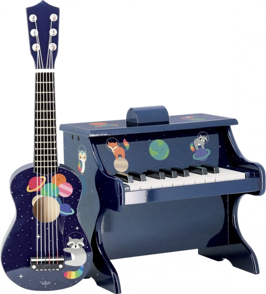Nous vous présentons la Guitare Spatiale, l'instrument idéal pour les petits musiciens et les amateurs d'aventures spatiales. Cette guitare pour enfants est fabriquée en bois, garantissant qualité et durabilité. Son design est enrichi de motifs planétaires colorés et d'une illustration de raton laveur astronome, faisant d'elle un véritable jouet de rêve.