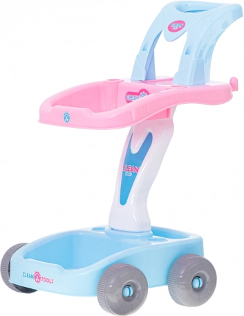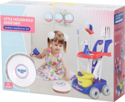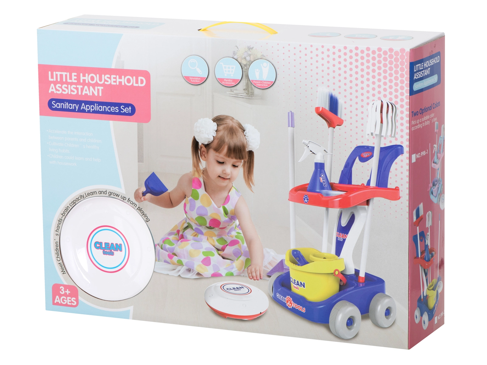 - Riche équipement : chariot avec étagères, aspirateur robot avec lumière et son, seau avec panier, serpillière, balayette, pelle, brosse sur manche, pelle sur manche, bouteille pour « nettoyant vitres ».