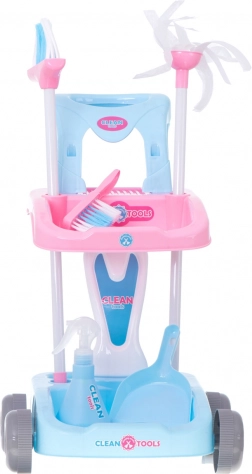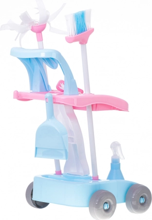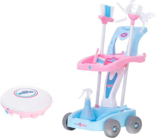 - Chariot de ménage avec étagères, aspirateur robot avec lumière et son, seau avec panier, serpillière, balayette, pelle, brosse sur manche, pelle sur manche, bouteille pour « nettoyant vitres »