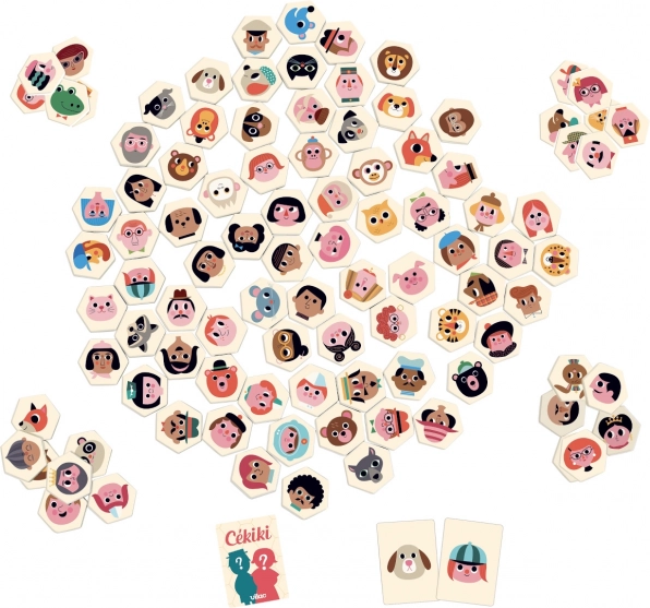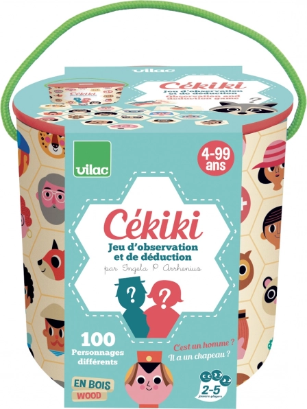VILAC CÉKIKI est un jeu vif d’observation et de devinettes avec des personnages originaux de l’illustratrice suédoise Ingela P. Arrhenius. Disposez les pièces en bois illustrées sur la table et essayez deux modes de jeu : soit vous devinez le personnage secret à l’aide de questions astucieuses, soit vous cherchez le plus vite possible l’image identique à celle de la carte retournée.
