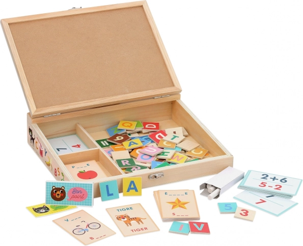 - Ardoise, 2 craies, 70 pièces en bois (lettres, chiffres, signes), 80 cartes de vocabulaire, 30 cartes d’exercices de calcul, 12 cartes de score