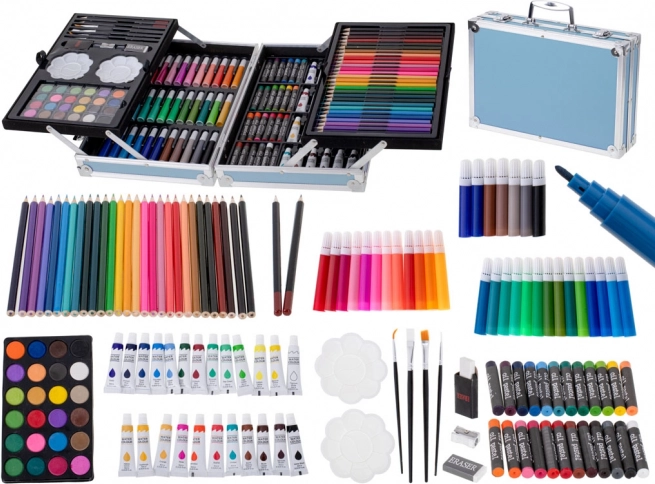 - Équipement complet 145 pcs : feutres, crayons de couleur, pinceaux, crayons, gommes, aquarelles, peintures en tube, pastels à l’huile, palettes et taille-crayon.