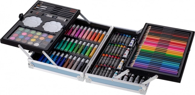 Set artistique universel dans une mallette pratique offrant tout pour les petits et grands artistes. Vous y trouverez un large choix de couleurs et d’outils pour le dessin et la peinture – des feutres et crayons de couleur aux aquarelles, peintures en tube et pastels à l’huile. Mallette bleue compacte avec fermetures solides gardant tout bien organisé, idéale à la maison, à l’école et en voyage. 145 pièces pour une créativité illimitée et développer l’imagination.
