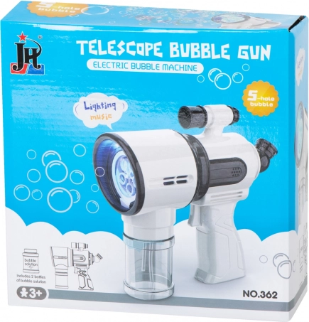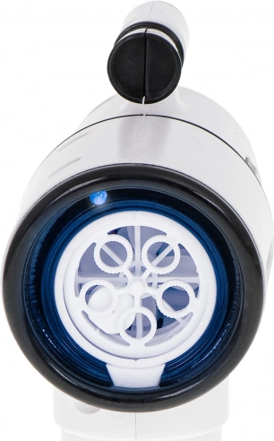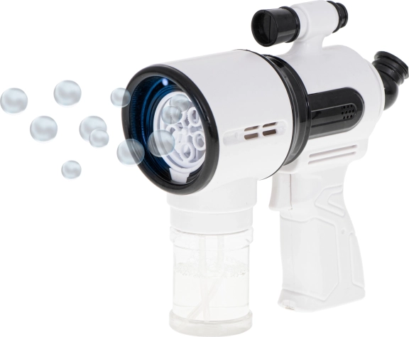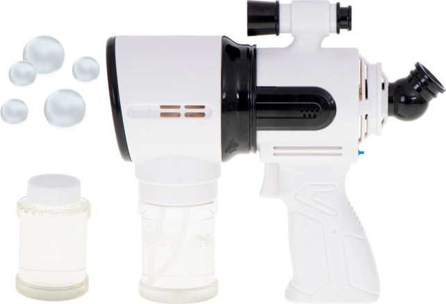 Ce pistolet à bulles blanc est idéal pour les enfants dès 3 ans ainsi que pour les activités familiales en plein air. Le ventilateur intégré et le système à 5 anneaux assurent un soufflage fluide et un flux de dizaines à centaines de bulles d’une simple pression sur la gâchette. Pour encore plus d’amusement, il dispose de lumières LED et d’effets sonores, activables ou désactivables via un seul bouton.