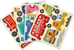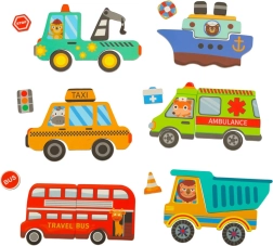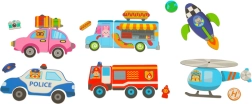 Autobus, ambulance, taxi, voiture de police, camion, bateau et fusée. Des éléments complémentaires comme les cônes ou les panneaux donnent vie à chaque scène.
